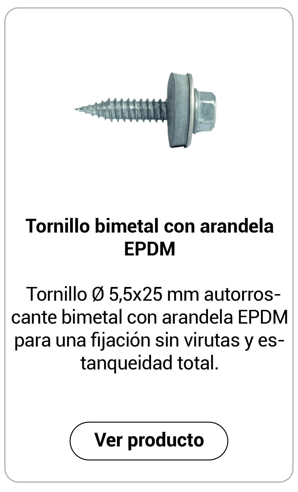 Tornillo Ø 5,5x25 mm autorroscante bimetal con arandela EPDM para una fijación sin virutas y estanqueidad total.